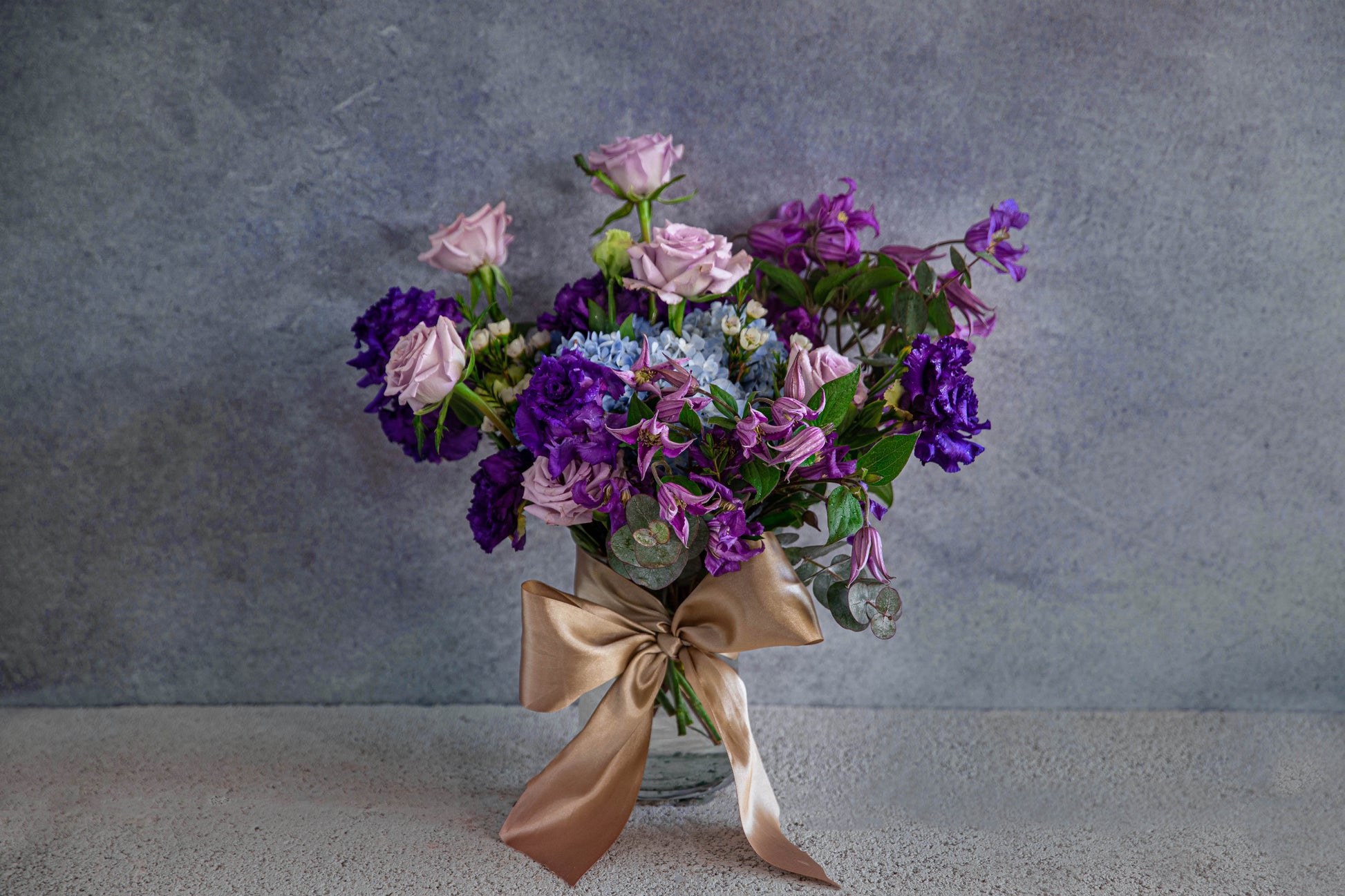 - Lilac Roses, Blue Hydrangeas, Purple Eustomas, Purple Clematis, White Wax flowers and Eucalyptus