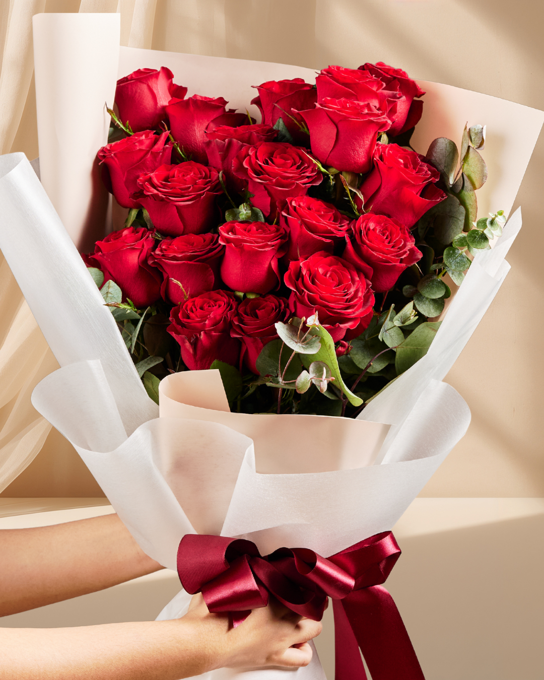 - This bouquet features: Bright Red Roses and Eucalyptus