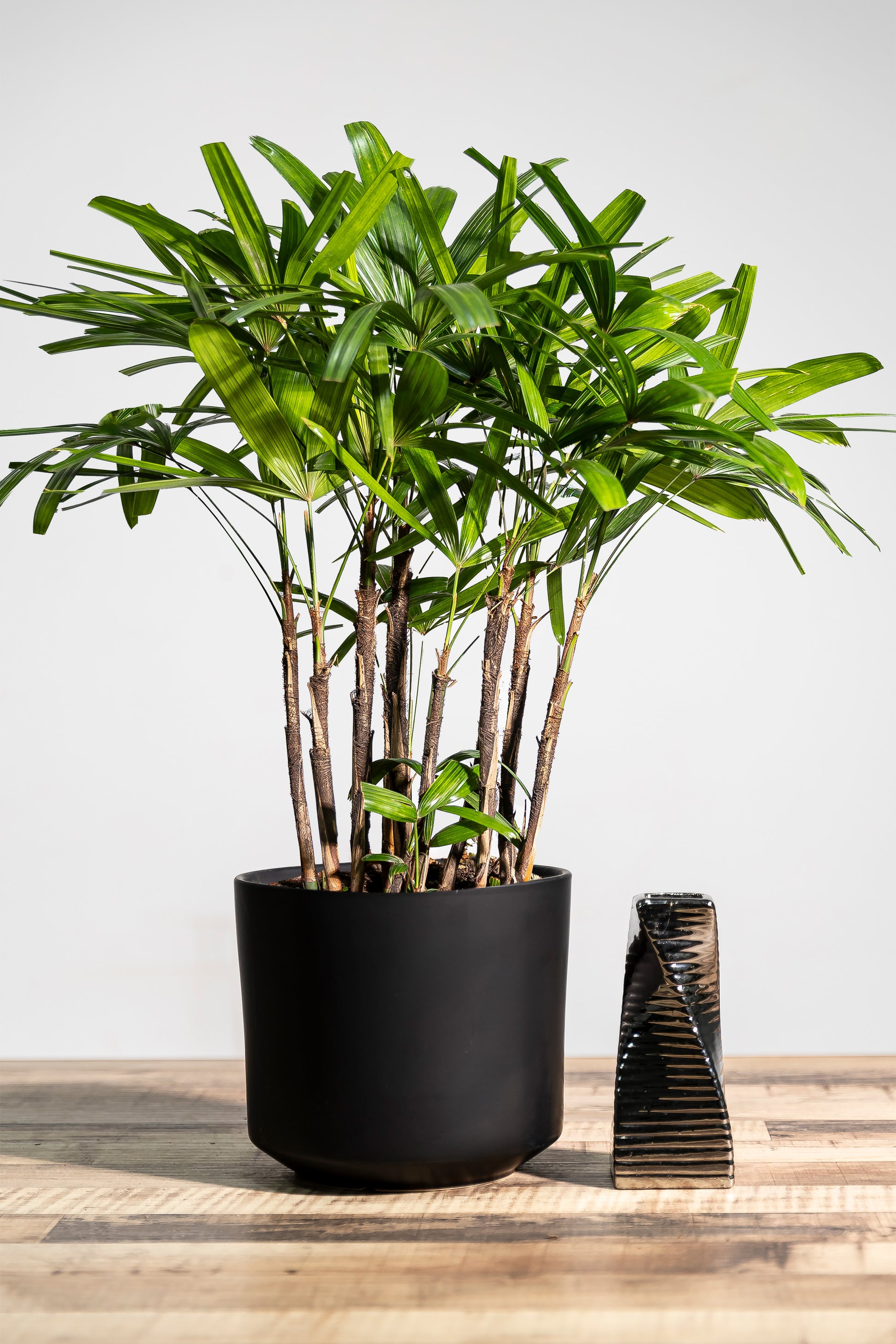 Rhapis excelsa is most often a small to medium-sized palm with beautiful, segmented fan leaves that persist along the stems. It grows in thick clumps. In between the upper leaves, it produces small spikes of cream flowers, which are followed by waxy, white fruits.