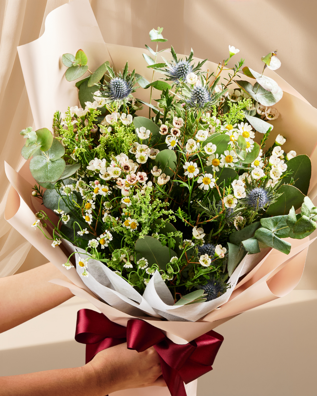 - This bouquet features: A mix of white and green wildflowers with Eucalyptus.